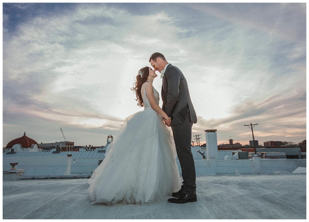 Once we got back to the venue to get the party started, the couple made their grand entrance, cut their cake, and danced as husband and wife. As the sun was starting to set, we grabbed them for a few sunset pictures on the roof of the venue. It was breathtaking!