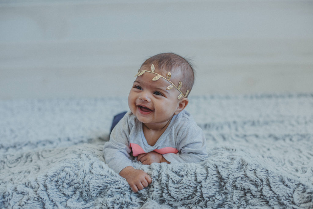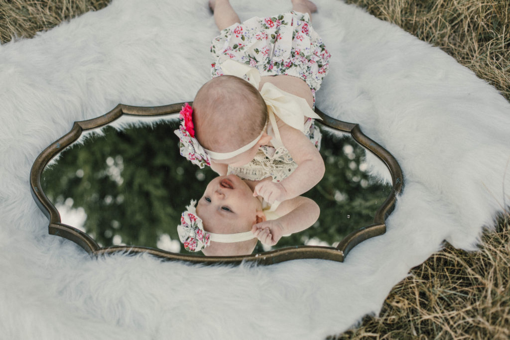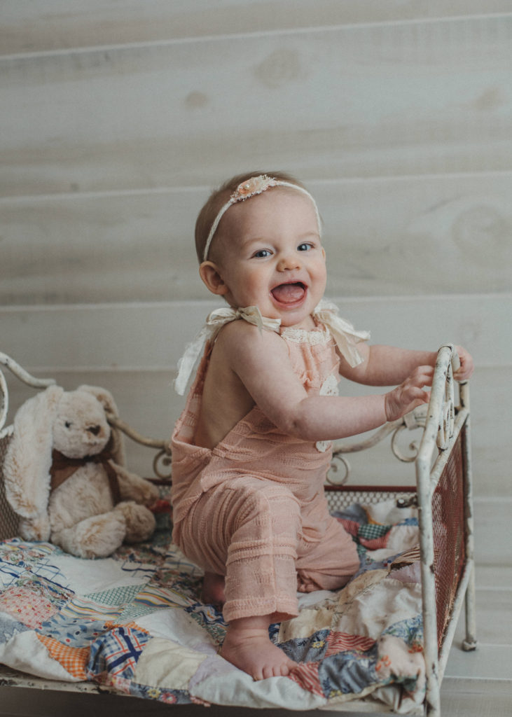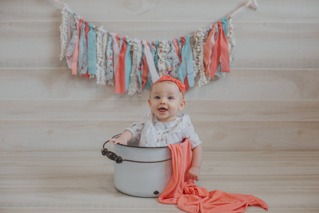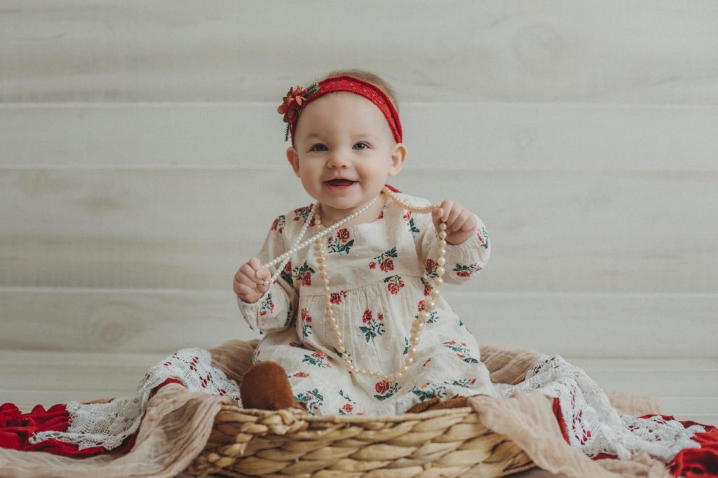 The Watch Me Grow package contains babies newborn, 3 month, 6 month, 9 month and 12 month milestones. Every three months your baby will have significant changes, from rolling over, to sitting, to standing… and then possibly walking before 12 months. I do my best of showcase all of these big milestones with the props that I use at every session.