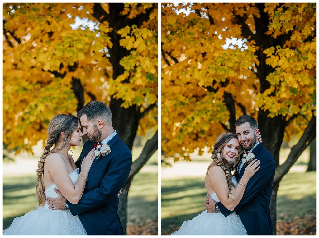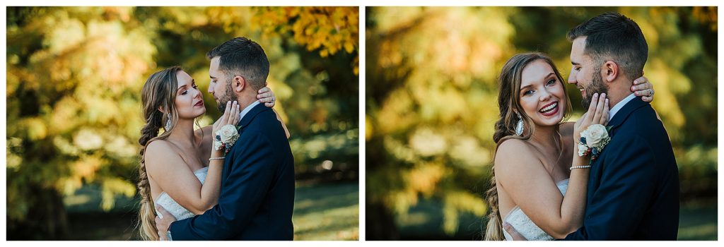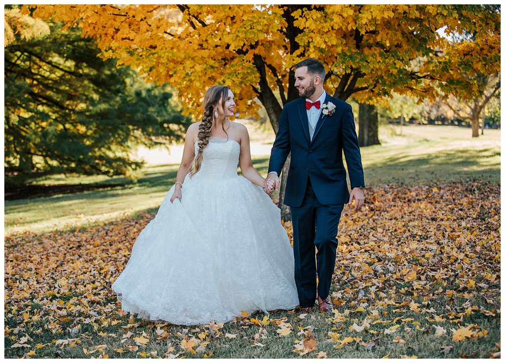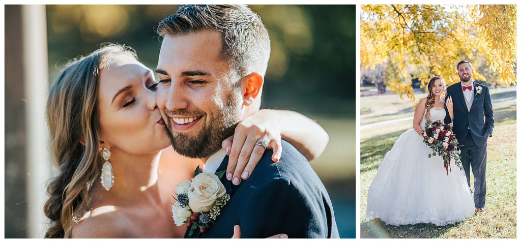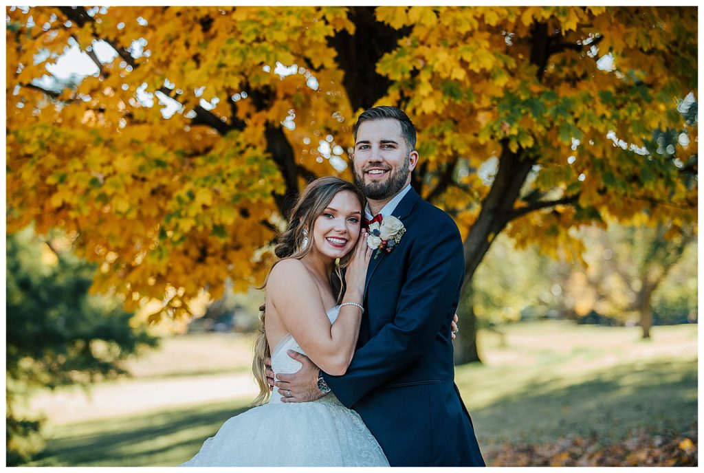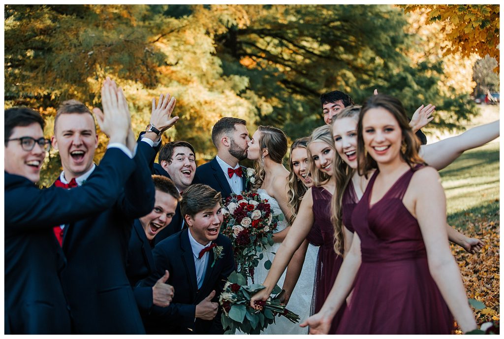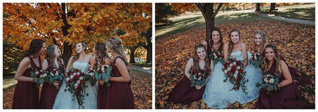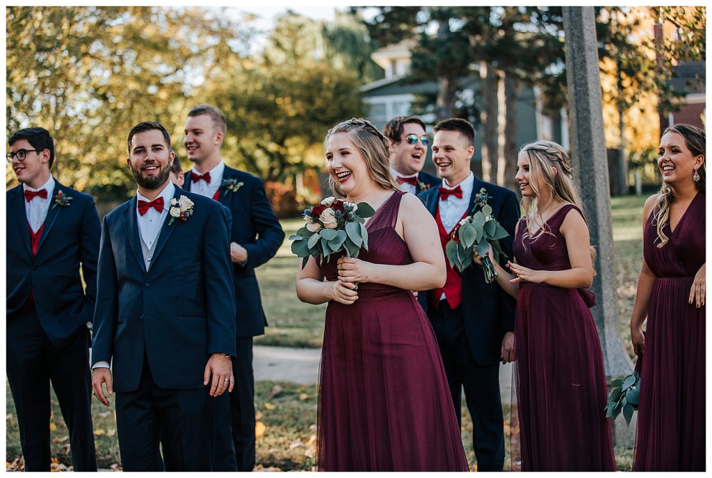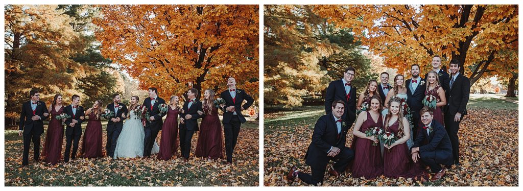 After the ceremony. we headed to College Hill Park, just across the street from their reception venue. The leaves on the trees were bright orange and yellow, perfect for this fall wedding. I placed the couple and bridal party in front of these trees where the light was gorgeous and gleaming through the branches. There was so much laughter the whole way through portraits, my jaws hurt from smiling so much.
