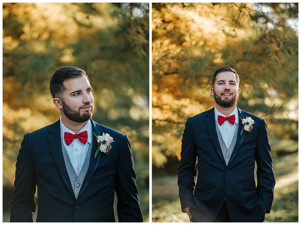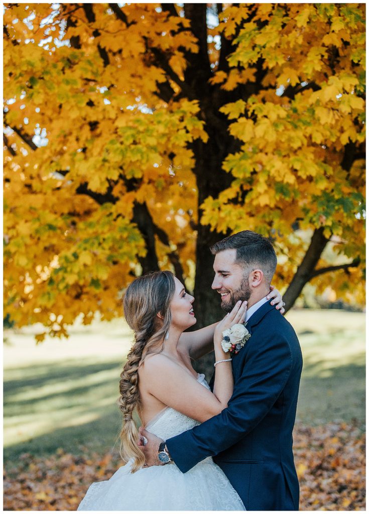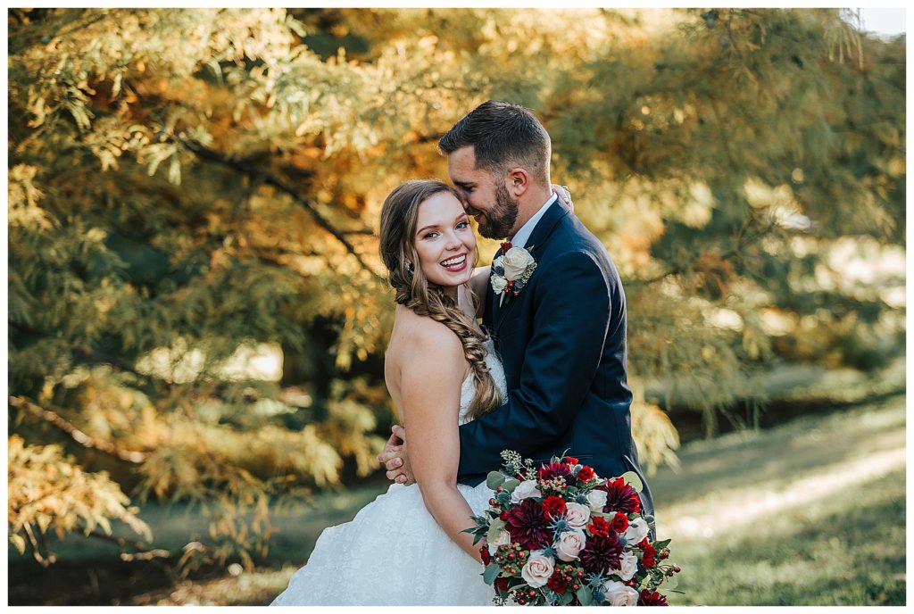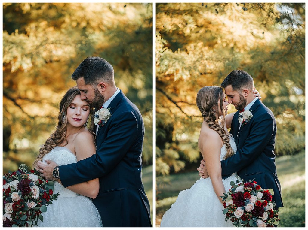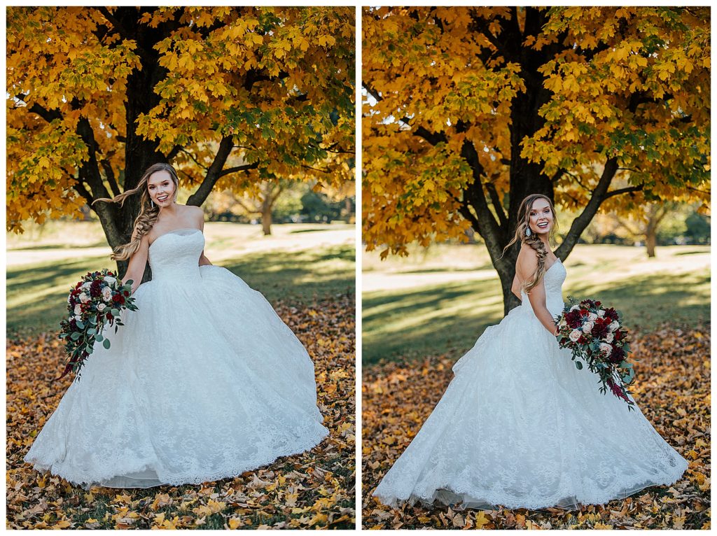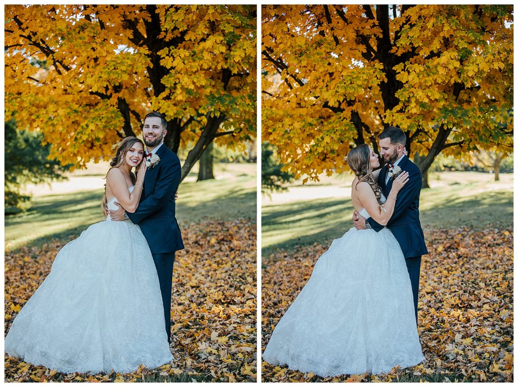 After the ceremony. we headed to College Hill Park, just across the street from their reception venue. The leaves on the trees were bright orange and yellow, perfect for this fall wedding. I placed the couple and bridal party in front of these trees where the light was gorgeous and gleaming through the branches. There was so much laughter the whole way through portraits, my jaws hurt from smiling so much.